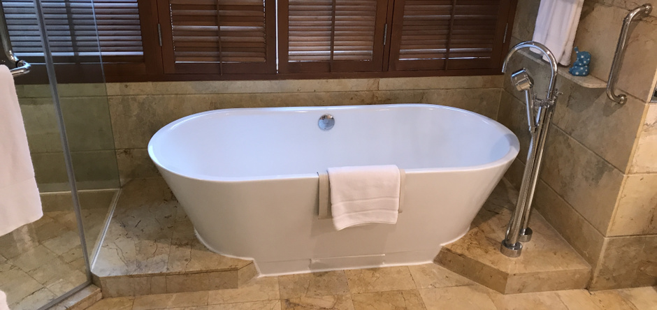 東南アジアで嬉しいバスタブ。歩いた疲れもこれで解消できそうです。大理石に大きなバスタブ、フカフカなタオル。部屋のツアーだけでも楽しいです。