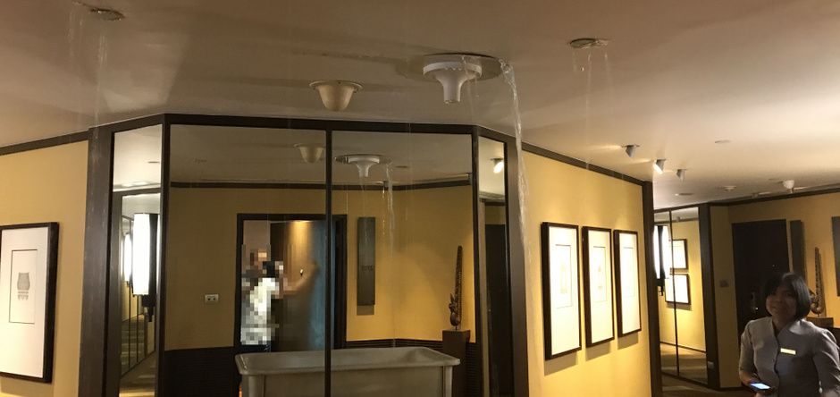 ありえない光景が目の前に・・・・・部屋の前の天井から水漏れ、しかも滝の様、しかも悪臭・・・部屋を出るに出れないのでフロントに連絡・・・。待つこと10分・・・