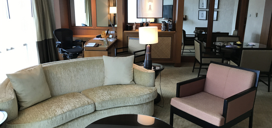 やはりラグジュアリー。部屋も落ち着いた雰囲気でしかもエグゼクティブスイート。一番安い部屋を予約しましたが、ヒルトンオーナーズ「ダイヤモンド」の特典で部屋のアップグレードされたようです。ただ泊まるのは私1人です・・・。広いとても広く快適です。