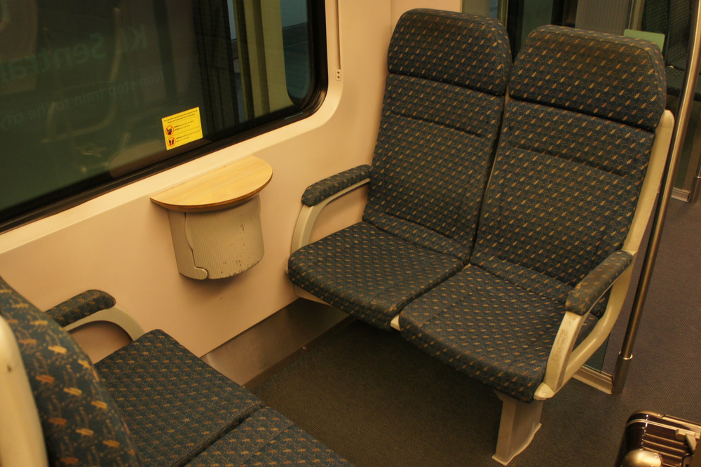 今回はプチ観光なので日本円で2,000円を両替。札が増えました。リンギットは綺麗なデザインのお金です。見ているだけで楽しいですね。両替したお金でKLIAエクスプレスのチケットを購入。大人片道55リンギット、往復だと100リンギットと少しお得になっています。所要時間は約30分席は日本でいうところの自由席になっています。つまり早い者勝ちということです。時間帯によっては座れないこともあるようです。私の場合は早朝について始発を待つ形でしたのでガラガラでした。
